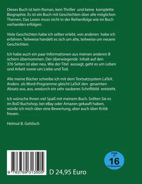 Dieses Buch ist kein Roman und auch keine Biographie. Die vielen Geschichten müssen auch nicht nacheinander gelesen werden. Es ist eine Aufstellung verschiedenster Geschichten aus allen möglichen Themenbereichen. Ein Buch zum Verschenken, weil jeder beschenkte bestimmt ein paar Geschichten findet, die ihm gefallen. Vielleicht wird man dann auch neugierig auf die anderen Geschichten. Empfohlen ist das Lesen ab 16 Jahren.