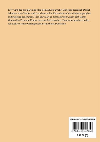 Christian Friedrich Daniel Schubart: Leben und Gesinnungen. Von ihm selbst im Kerker aufgesetzt Erstdruck des ersten Teils: Stuttgart (Mäntler) 1791; Erstdruck des zweiten Teils: Stuttgart (Mäntler) 1793. Vollständige Neuausgabe mit einer Biographie des Autors. Herausgegeben von Karl-Maria Guth. Berlin 2014. Textgrundlage sind die Ausgaben: Christian Friedrich Daniel Schubart: Schubarts Leben und Gesinnungen. Von ihm selbst, im Kerker aufgesetzt, Erster Theil, Stuttgart: Mäntler, 1791 [Nachdruck, mit einem Nachwort von Claus Träger, Leipzig: VEB Deutscher Verlag für Musik, 1980]. Schubart, Christian Friedrich Daniel: Schubart¿s Leben und Gesinnungen. Von ihm selbst, im Kerker aufgesetzt, Zweiter Theil, Herausgegeben von seinem Sohne Ludwig Schubart, Stuttgart: Mäntler, 1793 (Nachdruck, mit einem Nachwort von Claus Träger, Leipzig: VEB Deutscher Verlag für Musik, 1980). Die Paginierung obiger Ausgaben wird in dieser Neuausgabe als Marginalie zeilengenau mitgeführt. Umschlaggestaltung von Thomas Schultz-Overhage unter Verwendung des Bildes: August Friedrich Oelenhainz, Bildnis Christian Friedrich Daniel Schubart. Gesetzt aus Minion Pro, 11 pt. Über den Autor: 1777 wird der populäre und oft polemische Journalist Christian Friedrich Daniel Schubart ohne Verhör und Gerichtsurteil in Kerkerhaft auf dem Hohenasperg bei Ludwigsburg genommen. Vier Jahre darf er nicht schreiben, nach acht Jahren können ihn Frau und Kinder das erste Mal besuchen. Dennoch entstehen in den zehn Jahren seiner Gefangenschaft seine besten Gedichte.