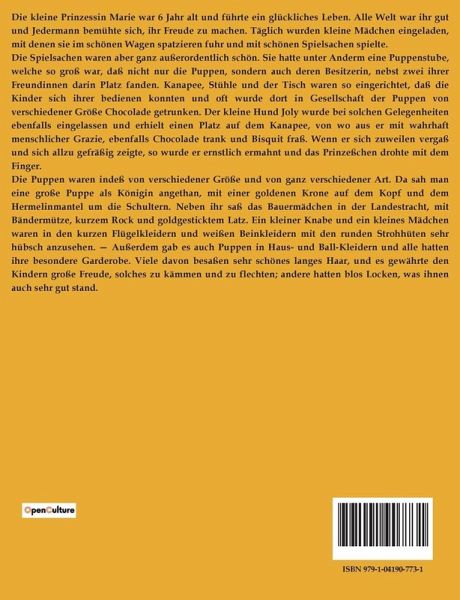 Die kleine Prinzessin Marie war 6 Jahr alt und führte ein glückliches Leben. Alle Welt war ihr gut und Jedermann bemühte sich, ihr Freude zu machen. Täglich wurden kleine Mädchen eingeladen, mit denen sie im schönen Wagen spatzieren fuhr und mit schönen Spielsachen spielte. Die Spielsachen waren aber ganz außerordentlich schön. Sie hatte unter Anderm eine Puppenstube, welche so groß war, daß nicht nur die Puppen, sondern auch deren Besitzerin, nebst zwei ihrer Freundinnen darin Platz fanden. Kanapee, Stühle und der Tisch waren so eingerichtet, daß die Kinder sich ihrer bedienen konnten und oft wurde dort in Gesellschaft der Puppen von verschiedener Größe Chocolade getrunken. Der kleine Hund Joly wurde bei solchen Gelegenheiten ebenfalls eingelassen und erhielt einen Platz auf dem Kanapee, von wo aus er mit wahrhaft menschlicher Grazie, ebenfalls Chocolade trank und Bisquit fraß. Wenn er sich zuweilen vergaß und sich allzu gefräßig zeigte, so wurde er ernstlich ermahnt und das Prinzeßchen drohte mit dem Finger. Die Puppen waren indeß von verschiedener Größe und von ganz verschiedener Art. Da sah man eine große Puppe als Königin angethan, mit einer goldenen Krone auf dem Kopf und dem Hermelinmantel um die Schultern. Neben ihr saß das Bauermädchen in der Landestracht, mit Bändermütze, kurzem Rock und goldgesticktem Latz. Ein kleiner Knabe und ein kleines Mädchen waren in den kurzen Flügelkleidern und weißen Beinkleidern mit den runden Strohhüten sehr hübsch anzusehen. ¿ Außerdem gab es auch Puppen in Haus- und Ball-Kleidern und alle hatten ihre besondere Garderobe. Viele davon besaßen sehr schönes langes Haar, und es gewährte den Kindern große Freude, solches zu kämmen und zu flechten; andere hatten blos Locken, was ihnen auch sehr gut stand.