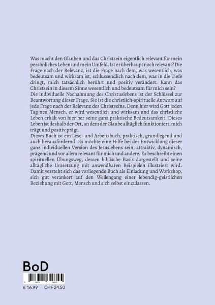 Was macht den Glauben und das Christsein eigentlich relevant für mein persönliches Leben und mein Umfeld. Ist er überhaupt noch relevant? Die Frage nach der Relevanz, ist die Frage nach dem, was wesentlich, was bedeutsam und wirksam ist, schlussendlich nach dem, was in die Tiefe dringt, mich tatsächlich berührt und positiv verändert. Kann das Christsein in diesem Sinne wesentlich und bedeutsam für mich sein?Die individuelle Nachahmung des Christuslebens ist der Schlüssel zur Beantwortung dieser Frage. Sie ist die christlich-spirituelle Antwort auf jede Frage nach der Relevanz des Christseins. Denn hier wird Gott jeden Tag neu Mensch, er wird wesentlich und wirksam und das christliche Leben erhält von hier her seine ganz praktische Bedeutsamkeit. Dieses Leben ist deshalb der Ort, an dem der Glaube alltäglich funktioniert, mich trägt und positiv prägt. Dieses Buch ist ein Lese- und Arbeitsbuch, praktisch, grundlegend und auch herausfordernd. Es möchte eine Hilfe bei der Entwicklungdieser ganz individuellen Version des Jesuslebens sein, attraktiv, dynamisch, prägend und vor allem relevant für mich und andere. Es beschreibt einen spirituellen Übungsweg, dessen biblische Basis dargestellt und seine alltägliche Umsetzung mit anwendbaren Beispielen illustriert wird. Damit versteht sich das vorliegende Buch als Einladung und Workshop, sich gut verankert auf den Wellengang einer lebendig-geistlichen Beziehung mit Gott, Mensch und sich selbst einzulassen.