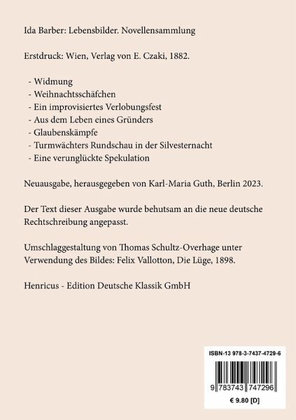 Ida Barber: Lebensbilder. NovellensammlungErstdruck: Wien, Verlag von E. Czaki, 1882.Inhaltsverzeichnis:Lebensbilder.Widmung.Weihnachtsschäfchen.Ein improvisiertes Verlobungsfest.Aus dem Leben eines Gründers.Glaubenskämpfe.Turmwächters Rundschau in der Silvesternacht.Eine verunglückte Spekulation.Neuausgabe, herausgegeben von Karl-Maria Guth, Berlin 2023.Der Text dieser Ausgabe wurde behutsam an die neue deutsche Rechtschreibung angepasst.Umschlagabbildung: Felix Vallotton, Die Lüge, 1898Gesetzt aus der Minion Pro, 11 pt.Die Sammlung Hofenberg erscheint im Verlag Henricus - Edition Deutsche Klassik GmbH, Berlin