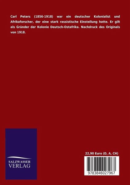 Carl Peters (1856-1918) war ein deutscher Kolonialist und Afrikaforscher, der eine stark rassistische Einstellung hatte. Er gilt als Gründer der Kolonie Deutsch-Ostafrika. Nachdruck des Originals von 1918.