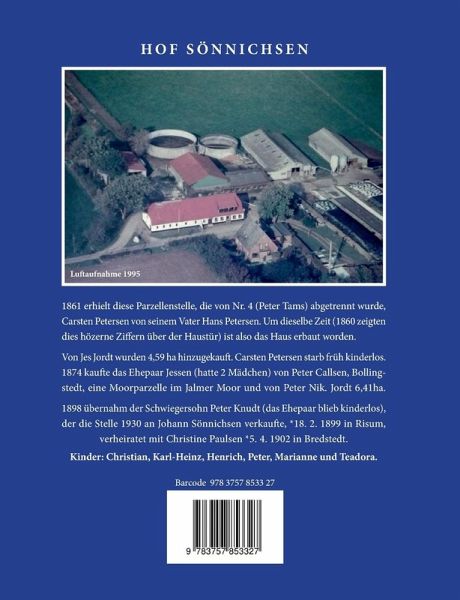 Christian Sönnichsen, Jahrgang 1925, wuchs auf dem landwirtschaftlichen Betrieb der Eltern in Langstedt, Schleswig-Holstein, auf. Nach der Schulzeit Lehre zum Feinmechaniker, die aber abgebrochen wurde. Mit 17 Jahren Kriegsfreiwilliger. Diverse Ausbildungsstationen bei der Luftwaffe. Zum Kiegsende Gefangenschaft. 1945 wieder zuhause. Jetzt eine landwirtschaftliche Ausbildung in einer Fremdlehre. Dann Ausbildung zum Landwirtschaftsmeister. Ab 1950 auf dem elterlichen Hof. Heirat 1953.1965 Übernahme des Betriebs. Viele Jahre berufsständische Arbeit. 1997, nach Ende der aktiven Landwirtschaft, begann das Interesse für die heimatliche Geschichte, ebe Daraus entwickelte sich eine erste Buchveröffentlichung über "Militärische Anlagen im Landesteil Südschleswig", Relikte, Spuren, Standorte. ISBN-13: 9783751936170, Verlag: BoD