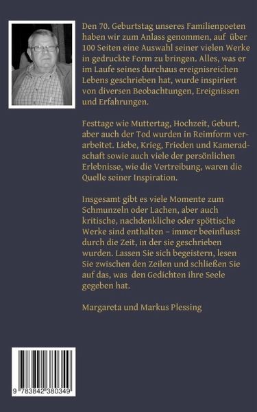 Den 70. Geburtstag unseres Familienpoeten haben wir zum Anlass genommen, auf über 100 Seiten eine Auswahl seiner vielen Werke in gedruckte Form zu bringen. Alles, was er im Laufe seines durchaus ereignisreichen Lebens geschrieben hat, wurde inspiriert von diversen Beobachtungen, Ereignissen und Erfahrungen.Festtage wie Muttertag, Hochzeit, Geburt, aber auch der Tod wurden in Reimform verarbeitet. Liebe, Krieg, Frieden und Kameradschaft sowie auch viele der persönlichen Erlebnisse, wie die Vertreibung, waren die Quelle seiner Inspiration.Insgesamt gibt es viele Momente zum Schmunzeln oder Lachen, aber auch kritische, nachdenkliche oder spöttische Werke sind enthalten - immer beeinflusst durch die Zeit, in der sie geschrieben wurden. Lassen Sie sich begeistern, lesen Sie zwischen den Zeilen und schließen Sie auf das, was den Gedichten ihre Seele gegeben hat.Margareta und Markus Plessing
