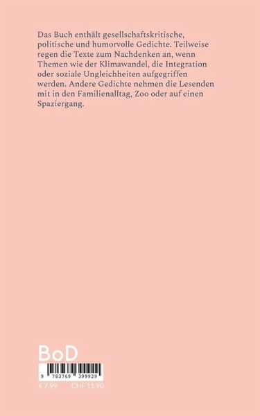 Das Buch enthält gesellschaftskritische, politische und humorvolle Gedichte. Teilweise regen die Texte zum Nachdenken an, wenn Themen wie der Klimawandel, die Integration oder soziale Ungleichheiten aufgegriffen werden. Andere Gedichte nehmen die Lesenden mit in den Familienalltag, Zoo oder auf einen Spaziergang.