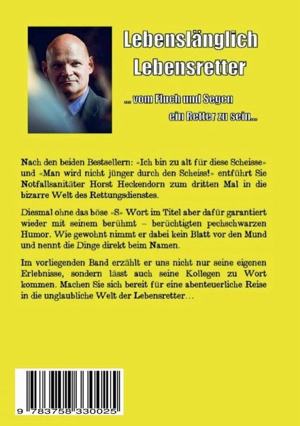 Nach den beiden Bestsellern: "Ich bin zu alt für diese Scheisse!" und: "Man wird nicht jünger durch den Scheiss!" entführt Sie Notfallsanitäter Horst Heckendorn zum dritten Mal in die unglaubliche, aber wahre Welt des Rettungsdienstes.Diesmal ohne das böse "S" Wort im Titel aber garantiert wieder mit seinem berühmt- berüchtigten rabenschwarzen Humor. Wie gewohnt nimmt er kein Blatt vor den Mund und nennt die Dinge direkt beim Namen. Im vorliegenden dritten Band der Reihe erzählt uns Horst Heckendorn nicht nur seine eigenen Erlebnisse aus 33 Jahren Notfallrettung, sondern lässt auch seine Kollegen zu Wort kommen. Machen Sie sich bereit für eine haarsträubende Reise in die bizarre Welt der Lebensretter.