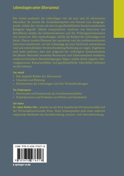Die Arbeit analysiert die Lebenslagen von als arm und alt adressierten Menschen. Sie nimmt die Armutskonzeption von Simmel zum Ausgangspunkt, welche den Armen als eine im gesellschaftlichen Kontext produzierte Kategorie begreift. Mittels interpretativer Analysen von Interviews mit Betroffenen werden die Lebenssituationen und die Wirkungsmechanismen von Armut im Alter nachvollzogen, welche die Einheit der Lebenslagen mit formt. Hierzu werden Elemente des narrativen und des problemzentrierten Interviews kombiniert, um der Lebenslage als einer historisch entstandenen und sich entwickelnden Strukturbeziehung Rechnung zu tragen. Ergebnisse sind unter anderem, dass sich aufgrund der verfestigten Armutssituation bei älteren Menschen monetäre Ressourcen und Lebensstandard annähern, wodurch kumulative Benachteiligungen folgen, welche durch negative Alterungsprozesse, Kohorteneffekte und gesellschaftliche Altersbilder befördert werden können.