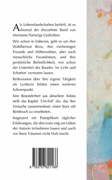 Als Lebenslandschaften betitelt, ist es diesmal der dreizehnte Band von Marianne Hartwigs Gedichten.Wie schon in früheren, geht es um ihre Wahlheimat Ibiza, ihre vierbeinigen Freunde und Mitbewohner, aber auch menschliche Freundinnen, und ihre persönliche Befindlichkeit, wie schon der Untertitel des Bandes "Im Licht und Schatten" vermuten lassen.Reflexionen über ihre eigene Tätigkeit als Lyrikerin bilden einen weiteren Schwerpunkt.Eine Besonderheit aus aktuellem Anlass stellt das Kapitel "Um-Fall" dar, das ihre Versuche zusammenfasst, einen Sturz mit Beinbruch zu verarbeiten.Insgesamt ein Panoptikum täglicher Erfahrungen, die den Leser eng am Leben der Autorin teilnehmen lassen und auch vor ihren Träumen nicht Halt macht.