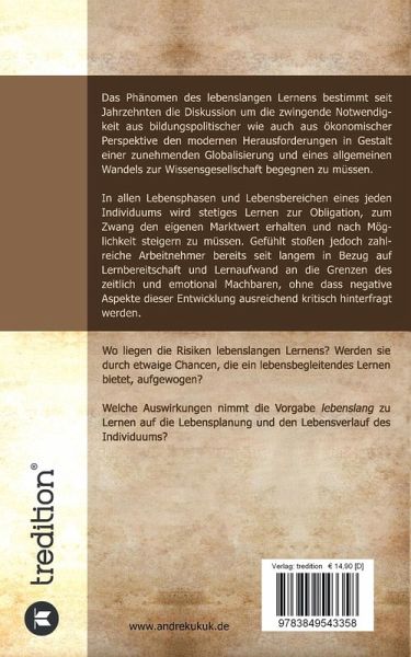 Das Phänomen des lebenslangen Lernens bestimmt seit mehreren Jahrzehnten die Diskussion um die zwingende Notwendigkeit aus bildungspolitischer wie auch aus ökonomischer Perspektive den modernen Herausforderungen in Gestalt einer zunehmenden Globalisierung und eines allgemeinen Wandels zur Wissensgesellschaft begegnen zu müssen. In allen Lebensphasen und Lebensbereichen wird Lernen zur Obligation um die eigene Verwertbarkeit aufrechtzuerhalten und nach Möglichkeit noch zu verbessern. Gefühlt stoßen jedoch zahlreiche Arbeitnehmer bereits seit langem in Bezug auf Lernbereitschaft und Lernaufwand an die Grenzen des zeitlich und emotional Machbaren, ohne dass negative Aspekte dieser Entwicklung ausreichend kritisch hinterfragt werden. Nach wie vor dominieren zumeist ökonomische Interessen pädagogische Konzepte der Wissensvermittlung, deren oftmals konträre Handlungslogiken in erster Linie auf dem Rücken der Arbeitnehmer ausgetragen werden. Betriebliche Zeitordnungen und pädagogische Zeitmuster differieren in der Regel erheblich und führen nur selten zu einer lerngerechten Atmosphäre und einem entspannten Arbeitsumfeld. Zunehmend werden Arbeitnehmer in allen Lebensphasen und Lebensbereichen - auch in ihrer Freizeit - durch mehr oder weniger freiwillige Fortbildungsmaßnahmen gefordert die eigene Leistungs-fähigkeit und den eigenen Marktwert zu erhöhen. Diese Art der mehr oder weniger fremdbestimmten Verpflichtung zur Weiterbildung schränkt nicht nur die grundsätzliche Gestaltungsfreiheit des Individuums erheblich ein, sondern verändert seit Jahren auch den Lebensverlauf des durchschnittlichen Arbeitnehmers nachhaltig. Heutzutage kann nicht mehr von einer strikten Trennung zwischen Ausbildung - Erwerbsleben - Ruhestand ausgegangen werden, da das Konzept des lebenslangen Lernens omnipräsent einzelne Teilbereiche des Lebenslaufs zu überdecken und zu verwischen scheint.Wo liegen die Risiken lebenslangen Lernens? Werden sie durch etwaige Chancen, die ein lebensbegleitendes Lernen bietet, aufgewogen?Welche Auswirkungen nimmt die Vorgabe lebenslang zu Lernen auf die Lebensplanung und den Lebensverlauf des Individuums?