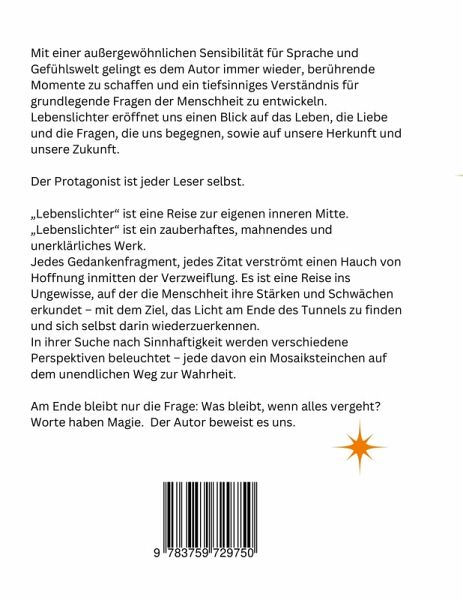 Lebenslichter ist ein wunderschönes, lebensbegleitendes Geschenkbuch mit inspirierenden Kurzgeschichten, spirituellen Gedanken, Zitaten, Illustrationen und Poesie.Lebenslichter ist ein Werk, das den Lesern helfen kann, einen neuen Blick auf den Sinn des eigenen Daseins zu werfen. Mit einer außergewöhnlichen Sensibilität für Sprache und Gefühlswelt gelingt es dem Autor, berührende Momente zu schaffen und ein Verständnis für grundlegende Fragen der Menschheit zu entwickeln. Lebenslichter eröffnet uns einen Blick auf das Leben und die Fragen, die uns begegnen, sowie auf unsere Herkunft und unsere Zukunft. Der Protagonist ist jeder Leser selbst. Es geht nicht nur um die großen Themen des Lebens, um das, was uns verbindet und was uns trennt. Der Konflikt, der in diesem Buch behandelt wird, ist der zwischenmenschliche, der gesellschaftliche, der spirituelle und der mystische. Lebenslichter ist ein zauberhaftes, mahnendes und unerklärliches Werk, das den Leser, scheinbar ungeordnet, unsortiert, tiefer und tiefer in seine innere Welt entführt.Eine Welt voller Rätsel, Geheimnisse, Erkenntnisse und Hinweise. Das Leben ist eine Reise ins Ungewisse, auf der jeder Mensch seine Stärken und Schwächen erkundet, mit dem Ziel, sich selbst darin wiederzuerkennen. Am Ende bleibt nur die Frage, was bleibt, wenn alles vergeht? Worte haben Magie. Der Autor beweist es uns.