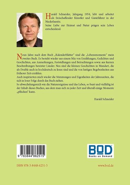 Neun Jahre nach dem Buch "Kalenderblätter" sind die "Lebensmomente" mein zweites Buch. Es besteht wieder aus einem Mix von Erzählungen, Gedichten und Geschichten, aus Anmerkungen, Feststellungen und Betrachtungen sowie aus kurzen Beschreibungen bereister Länder. Neu sind die kleinen Geschichten in Mundart, die als Double auch in hochdeutsch zu lesen sind und die von lustigen Begebenheiten aus früherer Zeit erzählen. Auch inspirierten mich wieder die Stimmungen und Eigenheiten der Jahreszeiten, die sich in loser Folge durch das Buch ziehen. So abwechslungsreich wie die Naturereignisse und das Leben, so bunt und vielfältig ist der Inhalt dieses Buches, aus dem man sich zu jeder Zeit und überall einige Momente "pflücken" kann.Harald Schneider