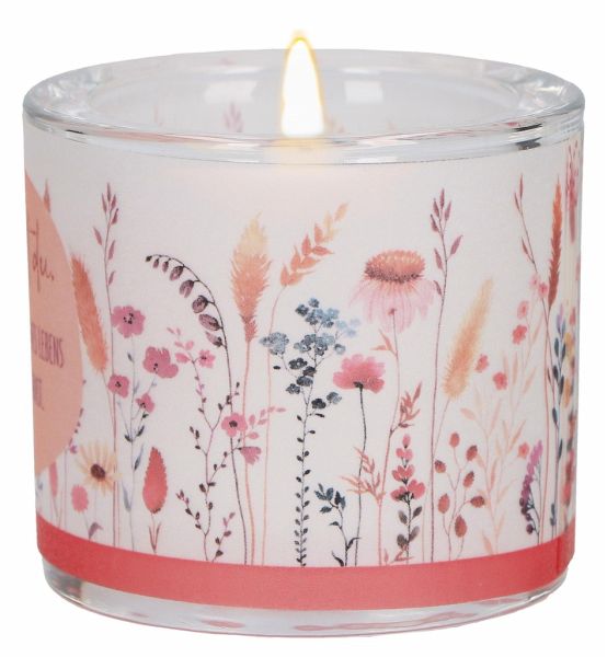 Das schöne LichtMoment "Lebenssegen" begeistert mit einem liebevoll arrangierten floralen Design. Das hochwertige Windlicht ist aus mundgeblasenem Glas gefertigt. Auf dem im Vierfarbdruck gestalteten Pergamentumleger sind Wiesenblumen zu erkennen. Den Text von Klaus Vellguth "Gesegnet bist du, wenn du über die Schönheit deines Lebens jeden Tag neu staunen kannst." ist auf der Banderole auch zu lesen. Das Windlicht zum Geburtstag hat die Maße 6,5 x 6 Zentimeter und passt daher auf jeden Tisch im Haus. Wenn die Flamme eines echten oder eines elektrischen Teelichts im LichtMoment brennt, dann leuchten die Blumen geheimnisvoll auf. Das Windlicht wird in der rosa Geschenkverpackung inklusive Teelicht geliefert.