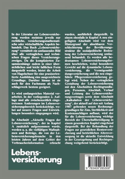 A. Grundlegendes über die Lebensversicherung.- B. Formen der Lebensversicherung.- C. Vertragliche Gestaltung der Lebensversicherung.- D. Kalkulation der Lebensversicherung.- E. Überschußbeteiligung in der Lebensversicherung.- F. Sonderfragen der Lebensversicherung.- Literaturhinweise.- Stichwortverzeichnis.