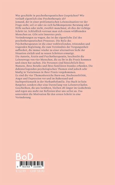 Was geschieht in psychotherapeutischen Gesprächen? Wie verläuft eigentlich eine Psychotherapie? Jemand, der in einer problematischen Lebenssituation vor der Frage steht, soll er sich fachkompetente Beratung oder Hilfe suchen, zweifelt manchmal, ob dies der richtige Schritt ist. Schließlich vertraut man sich einem wildfremden Menschen an. Gibt sein Innerstes preis. Veränderungen zu wagen, das ist das eigentliche Ziel des psychotherapeutischen Prozesses. Die Autorin, Ärztin und Psychotherapeutin, beschreibt die Lebenswege von vier Menschen, die zu ihr in die Praxis kommen und einen Rat suchen. Die Personen sind hinsichtlich ihres Namens, ihres Berufs und ihres familiären Standes erfunden. Die dahinterliegenden psychologischen Themen sind jedoch sehr häufig in Variationen in ihrer Praxis vorgekommen. Es sind die vier Themenbereiche Burn-out, Hochsensibilität, Angst und Depression und Suchtproblematik in der Herkunftsfamilie. Das Buch ist kein Ratgeber, sondern eher eine Darstellung von Lebensverläufen. Geschichten, die uns berühren, bleiben oft länger im Gedächtnis und regen uns zur Reflexion über uns selbst an. Das unterstützt die Motivation für den ersten Schritt in eine Veränderung. Das Buch soll Mut machen, selbst die Initiative für einen neuen Lebensschritt zu ergreifen. Alleine oder mit fachlicher Unterstützung.