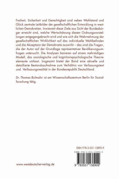 Freiheit, Sicherheit und Gerechtigkeit sind neben Wohlstand und Glück zentrale Leitbilder der gesellschaftlichen Entwicklung in westlichen Demokratien. Inwieweit diese Ziele aus Sicht der Bundesbürger erreicht sind, welche Wertschätzung diesen Ordnungsvorstellungen entgegengebracht wird und wie sich die Wahrnehmung der gesellschaftlichen Wirklichkeit auf das individuelle Wohlbefinden und die Akzeptanz der Demokratie auswirkt - das sind die Fragen, die der Autor auf der Grundlage repräsentativer Bevölkerungsumfragen untersucht. Die Analysen basieren auf einem mehrstufigen Modell, das soziologische und kognitionspsychologische Theorieelemente umfasst. Insgesamt bietet der Band eine aktuelle und detaillierte Bestandsaufnahme zum Verhältnis von Verfassungstext und Verfassungsrealität in der Bundesrepublik Deutschland.