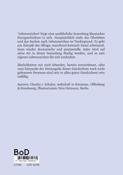 "Lebenszeichen" birgt eine Sammlung klassischer Kurzgeschichten in sich. Hauptsächlich steht das Überleben und das Suchen nach Lebenszeichen im Vordergrund. Es geht um Kämpfe des Alltags; manchmal komisch-banal scheinend, dann wieder dramatische und existentielle. Jeder wird auf seine Art in dieser Sammlung fündig werden, und so sein eigenes Lebenszeichen für sich entdecken.Ähnlichkeiten mit noch lebenden, bereits verstorbenen, oder zum Zeitpunkt der Herausgabe dieser Geschichten noch nicht geborenen Personen sind (wie in allen guten Geschichten) rein zufällig.Autorin: Claudia J. Schulze, Konstanz, Offenburg & Strasbourg, Illustrationen: Nico Heimann, Berlin