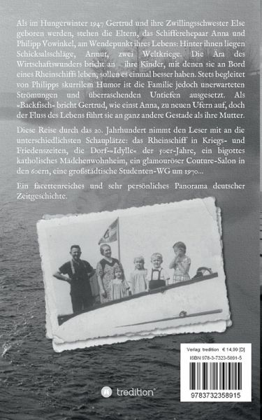 Als im Hungerwinter 1947 Gertrud und ihre Zwillingsschwester Else geboren werden, stehen die Eltern, das Schifferehepaar Anna und Philipp Vowinkel, am Wendepunkt ihres Lebens: Hinter ihnen liegen Schicksalsschläge, Armut, zwei Weltkriege. Die Ära des Wirtschaftswunders bricht an - ihre Kinder, mit denen sie an Bord eines Rheinschiffs leben, sollten es einmal besser haben. Stets begleitet von Philipps skurrilem Humor ist die Familie jedoch unerwarteten Strömungen und überraschenden Untiefen ausgesetzt. Als »Backfisch« bricht Gertrud, wie einst Anna, zu neuen Ufern auf, doch der Fluss des Lebens führt sie an ganz andere Gestade als ihre Mutter. Diese Reise durch das 20. Jahrhundert nimmt den Leser mit an die unterschiedlichsten Schauplätze: das Rheinschiff in Kriegs- und Friedenszeiten, die Dorf-»Idylle« der 50er-Jahre, ein bigottes katholisches Mädchenwohnheim, ein glamouröser Couture-Salon in den 60ern, eine großstädtische Studenten-WG um 1970...Ein facettenreiches und sehr persönliches Panorama deutscher Zeitgeschichte.