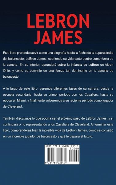 LEBRON JAMES Este libro pretende servir como una biografía hasta la fecha de la superestrella del baloncesto, LeBron James, cubriendo su vida tanto dentro como fuera de la cancha. En su interior, aprenderá sobre la infancia de LeBron en Akron Ohio, y cómo se convirtió en una fuerza tan dominante en la cancha de baloncesto.¿ A lo largo de este libro, veremos diferentes fases de su carrera, desde la escuela secundaria, hasta su primer período con los Cavaliers, hasta su época en Miami, y finalmente volveremos a su reciente período como jugador de Cleveland. También discutimos lo que podría ser el próximo paso de LeBron James, y si continuará o no representando a los Cavaliers de Cleveland. Al terminar este libro, comprenderás bien la increíble vida de LeBron James, cómo se convirtió en un increíble jugador de baloncesto y qué le depara el futuro. Esto es lo que aprenderás... La infancia de LeBron Carrera de la escuela secundaria Entrando en la NBA Mudarse a Miami Los logros de LeBron en la NBA Volviendo a Cleveland ¿Qué es lo próximo para LeBron James ¡Mucho, mucho más!