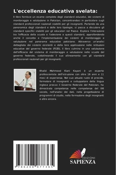 Il libro fornisce un esame completo degli standard educativi, dei sistemi di monitoraggio e valutazione in Pakistan, concentrandosi in particolare sugli standard professionali nazionali stabiliti per gli insegnanti. Partendo da una panoramica degli standard e delle loro tipologie, si passa a discutere gli standard specifici stabiliti per gli educatori nel Paese. Esplora l'interazione tra l'efficacia della scuola e l'adesione a questi standard, approfondendo anche il concetto e l'implementazione dei sistemi di monitoraggio e valutazione nel panorama educativo pakistano. Attraverso un'analisi dettagliata dei sistemi esistenti e della loro applicazione nelle istituzioni educative del governo federale (FGEI), il libro culmina in una valutazione dell'efficacia del sistema di monitoraggio e valutazione nelle scuole del governo federale, sottolineando il suo allineamento con gli standard professionali nazionali per gli insegnanti.