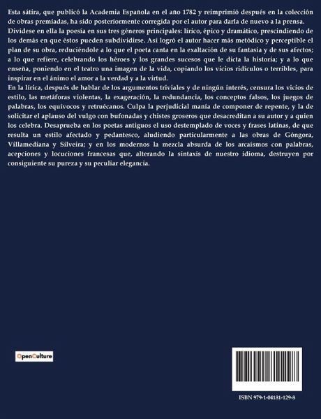 Esta sátira, que publicó la Academia Española en el año 1782 y reimprimió después en la colección de obras premiadas, ha sido posteriormente corregida por el autor para darla de nuevo a la prensa. Divídese en ella la poesía en sus tres géneros principales: lírico, épico y dramático, prescindiendo de los demás en que éstos pueden subdividirse. Así logró el autor hacer más metódico y perceptible el plan de su obra, reduciéndole a lo que el poeta canta en la exaltación de su fantasía y de sus afectos; a lo que refiere, celebrando los héroes y los grandes sucesos que le dicta la historia; y a lo que enseña, poniendo en el teatro una imagen de la vida, copiando los vicios ridículos o terribles, para inspirar en el ánimo el amor a la verdad y a la virtud. En la lírica, después de hablar de los argumentos triviales y de ningún interés, censura los vicios de estilo, las metáforas violentas, la exageración, la redundancia, los conceptos falsos, los juegos de palabras, los equívocos y retruécanos. Culpa la perjudicial manía de componer de repente, y la de solicitar el aplauso del vulgo con bufonadas y chistes groseros que desacreditan a su autor y a quien los celebra. Desaprueba en los poetas antiguos el uso destemplado de voces y frases latinas, de que resulta un estilo afectado y pedantesco, aludiendo particularmente a las obras de Góngora, Villamediana y Silveira; y en los modernos la mezcla absurda de los arcaísmos con palabras, acepciones y locuciones francesas que, alterando la sintaxis de nuestro idioma, destruyen por consiguiente su pureza y su peculiar elegancia.