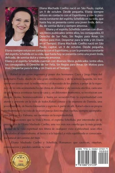 Rafael es un joven ingeniero y posee dos hermanos: Cayo y Jorge. Hijos del millonario Paulo, dueño de una gran constructora, y de la señora Augusta, los tres sufren un mismo mal: la indiferencia y el descuido de los padres, a pesar de la riqueza y de la vida acomodada. En ese clima de desamor y de carencia afectiva, cada uno de ellos busca aventuras fuera de casa y, en diferentes momentos, se involucran con drogas, fiestas, homosexualismo y hasta un secuestro. Pero la espiritualidad está atenta y presente en la vida de todos. Rafael conoce y se enamora de Daniela, una joven humilde, de buena formación y espírita. A partir de allí, Rafael educa su propia mediumnidad y la vida de la joven pareja dará muchas vueltas, siempre acompañados por Lucas y Fabiana, sus mentores en la espiritualidad. En Lecciones que la Vida Ofrece, el espíritu Schellida, por intermedio de la psicografía de Eliana Machado Coelho, una vez más nos enseña que la más grande verdad de la vida espiritual nos libera de cualquier vicio o dificultad, sean ellos vinculados al materialismo, al lucro o a la lujuria. La vida equilibrada es consecuencia natural del camino del bien. ¿ ¡Eliana Machado Coelho y Schellida, Romances que cautivan, enseñan, conmnueven y pueden cambiar tu vida!