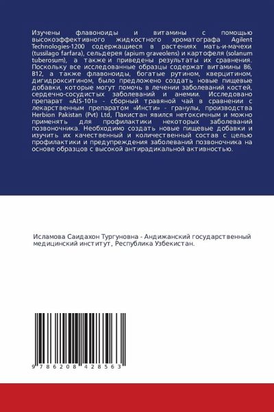 Izucheny flawonoidy i witaminy s pomosch'ü wysokoäffektiwnogo zhidkostnogo hromatografa Agilent Technologies-1200 soderzhaschiesq w rasteniqh mat'-i-machehi (tussilago farfara), sel'dereq (apium graveolens) i kartofelq (solanum tuberosum), a takzhe i priwedeny rezul'taty ih srawneniq. Poskol'ku wse issledowannye obrazcy soderzhat witaminy B6, B12, a takzhe flawonoidy, bogatye rutinom, kwercitinom, digidroxitinom, bylo predlozheno sozdat' nowye pischewye dobawki, kotorye mogut pomoch' w lechenii zabolewanij kostej, serdechno-sosudistyh zabolewanij i anemii. Issledowano preparat 'AIS-101' - sbornyj trawqnoj chaj w srawnenii s lekarstwennym preparatom 'Insti' - granuly, proizwodstwa Herbion Pakistan (Pvt) Ltd, Pakistan qwilsq netoxichnym i mozhno primenqt' dlq profilaktiki nekotoryh zabolewanij pozwonochnika. Neobhodimo sozdat' nowye pischewye dobawki i izuchit' ih kachestwennyj i kolichestwennyj sostaw s cel'ü profilaktiki i preduprezhdeniq zabolewanij pozwonochnika na osnowe obrazcow s wysokoj antiradikal'noj aktiwnost'ü.