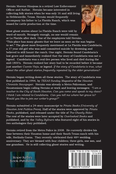 Hernán Moreno Hinojosa is a retired Law Enforcement Officer and Author. Hernán became interested in collecting folk stories when he was only 16 and still living in Hebbronville, Texas. Hernán would frequently accompany his father to La Florida Ranch, which was leased for cattle production at the time. Most ghost stories about La Florida Ranch were told by word-of-mouth. Strangely enough, no one would remain at La Florida after dark. One of the employees told Hernán, "This place has many ghosts that we leave as soon as the sun begins to set." The ghost most frequently mentioned at La Florida was Candelaria, a 17 year old girl who was said committed suicide by drowning and believed to still haunt the ranch. One night, Hernán found Candelaria's lost grave and immediately realized that the story of Candelaria was not a legend. Candelaria was a real-live person who lived and died during the mid-1800's. Hernán realized her story had to be recorded before it became just another Cuento Viejo, or legend. If the story of Candelaria is true, what about the other ghost stories frequently repeated by the older generations? Hernán began writing down all these stories. The story of Candelaria was first published in 1994, by TEXAS Sunday Magazine of the Houston Chronicle Newspaper. Hernán was already a Metro Policeman, and Houstonians begin calling Hernán at work and leaving messages; "I am a teacher in the City of South Houston. Can you come and speak to my class? I think I am related to Candelaria. Can you tell me where her grave is? Would you like to join our writer's group?" Hernán submitted a 24-story manuscript to Piñata Books (University of Houston Arté Publico Press). Half of the stories were approved by Piñata Books, published, and released under the title of The Ghostly Rider. The rest of the stories were later accepted by Overlooked Books and published, and by the Valley Byliners who featured eight of his stories in two anthologies they published. Hernán retired from the Metro Police in 2008. He currently divides his time between their Houston home and their South Texas ranch with his wife, Herlinda Garza. They recently celebrated their 48th wedding anniversary. They are blessed with four children; three girls, one son, and one grandson. He is still collecting ghost stories and writing. This is a really fun must-read! HOPE KELLEY BOOK PUBLISHING