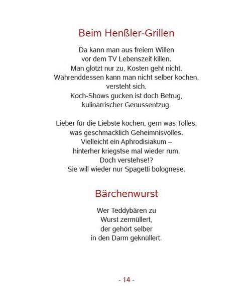 Der Thüringer Autor und Kabarettist Ulf Annel hat den Esstisch zum Schreibtisch gemacht, sich in der Küche umgesehen und viel Komisches entdeckt, auch Schwarzhumoriges - ohne etwas anbrennen zu lassen. Bedichtete Gerichte, gespiegelte Eier, knoblauchfrei und Spaß dabei. Denn:Küchendienst ist kein Dienst, wenn du grienst. Macht das Kochen Spaß, wird's meist was.Buchstabenhumor, ja schön. Aber richtig schön wird das Buch erst mit Bildern. Für "Leckergemecker" hat der Karikaturist Nel Bilder beigesteuert: zum Lächeln, zum Grinsen und zum Lachen