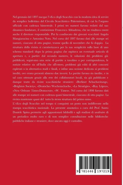 Nel gennaio del 1897 nacque L'Eco degli Scacchi, semplice bollettino del Circolo Scacchistico Palermitano, di cui fu l'organo ufficiale. I primi tre numeri furono redatti dal suo dinamico fondatore, il ventiseienne Francesco Abbadessa. Poi fu coadiuvato dai giovani scacchisti Angelo Mangiaracina e Antonino Noto. Nel corso del 1897 furono dati alle stampe sei numeri. Nel 1898 furono parimenti pubblicati sei numeri con cadenza quasi bimestrale, ciascuno di otto pagine. L'Eco degli Scacchi, nel tempo si conquistò un posto non indifferente nella stampa scacchistica nazionale. La presente anastatica, relativa al 1898, a cura del Prof. Santo Daniele Spina permette agli appassionati bibliofili e agli studiosi di usufruire di un periodico molto raro e di non semplice consultazione nelle biblioteche pubbliche italiane e straniere, dove è custodito.