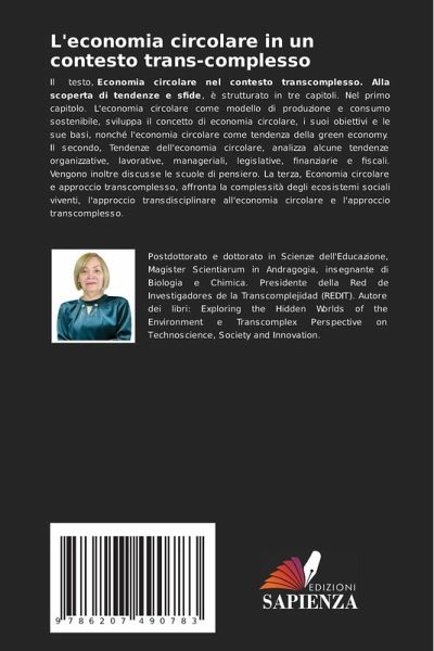 Il testo, Economia circolare nel contesto transcomplesso. Alla scoperta di tendenze e sfide, è strutturato in tre capitoli. Nel primo capitolo. L'economia circolare come modello di produzione e consumo sostenibile, sviluppa il concetto di economia circolare, i suoi obiettivi e le sue basi, nonché l'economia circolare come tendenza della green economy. Il secondo, Tendenze dell'economia circolare, analizza alcune tendenze organizzative, lavorative, manageriali, legislative, finanziarie e fiscali. Vengono inoltre discusse le scuole di pensiero. La terza, Economia circolare e approccio transcomplesso, affronta la complessità degli ecosistemi sociali viventi, l'approccio transdisciplinare all'economia circolare e l'approccio transcomplesso.