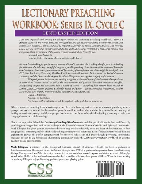 I am very impressed with the way Dr. Ellingsen outlines this Lectionary Preaching Workbook... Here is a splendid workbook. It is rich in detail and theological insight. Ellingsen writes clearly, is sensitive to context, and widens [our] horizons... This book should be required reading for all pastors, seminary students, and other lay people who are involved in ministry with adults and youth. It should be regarded as a textbook to enhance one's knowledge about the meaning of the seasons or major festivals of the [church] year. Reverend Jesse Averett Jr. Presiding Elder, Christian Methodist Episcopal Church If a preacher is looking for quick and easy sermons, this tool is not what s/he is seeking. But if a preacher is looking for solid biblical scholarship, thoughtful exegesis, a possible preaching theme for each of the appointed lessons for each Sunday in the lectionary year accompanied by a variety of ideas for how that theme might be developed, then CSS' latest Lectionary Preaching Workbook will be a valuable resource. Built around the Revised Common Lectionary and the Christian church year, Pr. Mark Ellingsen has put together a highly useful resource. Ellingsen's passion for justice and equality as applied to the social issues of the day comes through clearly in some of his "sermon moves" as well as the socio-economic and political illustrative connections he offers. Incorporating insights and quotations from a variety of sources -- everything from modern brain research to Luther, Calvin, Liberation Theology, Bonhoeffer, Pascal, and Barth -- Ellingsen strives to connect God's word to our world in ways that the preacher will find stimulating and inspirational. Glenn L. Simmons Assistant to the Bishop Northeastern Pennsylvania Synod, Evangelical Lutheran Church in America When it comes to preaching from a lectionary, it can often be a daunting task to create new ways of preaching about a passage that has been around for thousands of years. It would seem that, after a while, there would be no new ways of looking at a scripture passage. A different perspective, however, can be most beneficial in finding a new way to help your congregation see each of the readings. This is the inspiration behind the Lectionary Preaching Workbook series and this special edition for Lent and Easter. By providing new insights into each of the readings in the Revised Common, Roman Catholic, and Episcopal Lectionaries, Mark Ellingsen has given pastors everywhere the tools they need to effectively relate the heart of the scriptures to their congregations, combining the best of scholarly techniques with pastoral experience. Each of these illustrations and thematic explorations provide the perfect jumping point for pastors to take a text and create thought-provoking, inspirational messages. Its easy-to-use format and illuminating commentary make the Lectionary Preaching Workbook an essential addition to any pastor's library. Mark Ellingsen, a minister in the Evangelical Lutheran Church of America (ELCA), has been a professor at Interdenominational Theological Center in Atlanta, Georgia, since 1993. He graduated magna cum laude from Gettysburg College (Pennsylvania) and Yale University, from which he received three master's degrees in divinity, arts, and philosophy, as well as his Ph.D. He has authored seventeen books. He and his wife have three grown children. When he is not writing or teaching, Ellingsen enjoys discussing politics, sports, and playing guitar.