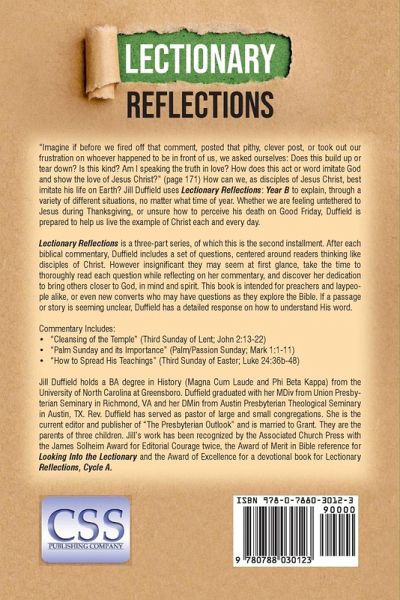 "Imagine if before we fired off that comment, posted that pithy, clever post, or took out our frustration on whoever happened to be in front of us, we asked ourselves: Does this build up or tear down? Is this kind? Am I speaking the truth in love? How does this act or word imitate God and show the love of Jesus Christ?" (171) How can we, as disciples of Jesus Christ, best imitate his life on Earth? Jill Duffield uses Lectionary Reflections: Year B to explain, through a variety of different situations, no matter what time of year. Whether we are feeling untethered to Jesus during Thanksgiving, or unsure how to perceive his death on Good Friday, Duffield is prepared to help us live the example of Christ each and every day. Lectionary Reflections, Cycle B is part of a three-part series, of which this is the second installment. After each biblical commentary, Duffield includes a set of questions, centered around readers thinking like disciples of Christ. However insignificant they may seem at first glance, take the time to thoroughly read each question while reflecting on her commentary, and discover her dedication to bring others closer to God, in mind and spirit. This book is intended for preachers and laypeople alike, or even new converts who may have questions as they explore the Bible. If a passage or story is seemingly unclear, Duffield has a detailed response on how to understand His word. Commentary Includes: "Cleansing of the Temple" (Third Sunday of Lent; John 2:13-22) "Palm Sunday and its Importance" (Palm/Passion Sunday; Mark 1:1-11) "How to Spread His Teachings" (Third Sunday of Easter; Luke 24:36b-48)