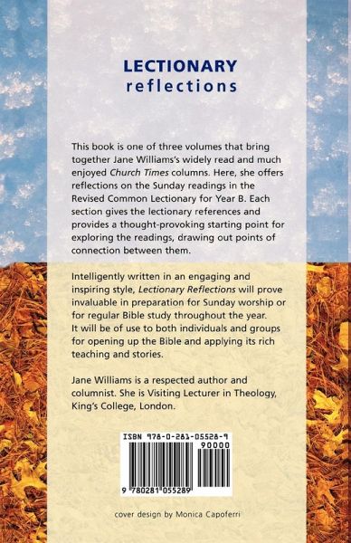 The bestselling Intercessions Handbook has been written to meet the challenges of the vital task of leading prayers in public worship. Easy to adapt to most situations, this volume contains a wealth of creative suggestions for enlivening prayers. Jane Williams takes each of the lectionary readings for the Sundays in Year B and gives us a way into the themes and concerns at their heart. Concentrating our attention in this way, we gradually deepen our understanding of what God means by faith, love, prayer and good living. 'Through the Son you will see the Father, through the Spirit you will see the Son, through the Father you will see what you are meant to be made in the image of the Son, to share in God's love and delight. God has made it as clear as he can, coming to live with us, sharing our life, so that we can share the life of the Father's only Son.' Intelligently written in an engaging and inspiring style, Lectionary Reflections will prove invaluable in preparation for Sunday worship or for regular Bible study throughout the year. It will be of use to both groups and individuals for opening up the Bible and applying its rich teaching and stories. Lectionary Reflections, Year A and Lectionary Reflections, Year C are both currently available, with Lectionary Reflections Year B completing the cycle.