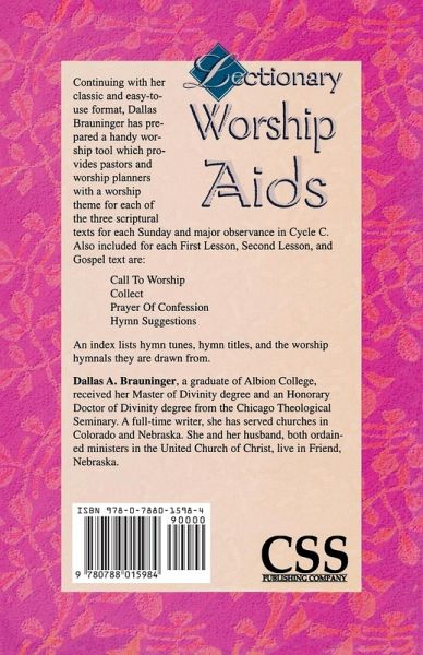 Continuing with her classic and easy-to-use format, Dallas Brauninger has prepared a handy worship tool which provides pastors and worship planners with a worship theme for each of the three scriptural texts for each Sunday and major observance in Cycle C. Also included for each First Lesson, Second Lesson, and Gospel text are: Call To Worship Collect Prayer Of Confession Hymn Suggestions An index lists hymn tunes, hymn titles, and the worship hymnals they are drawn from. Dallas A. Brauninger, a graduate of Albion College, received her Master of Divinity degree and an honorary Doctor of Divinity degree from Chicago Theological Seminary. A full-time writer, she has served churches in Colorado and Nebraska. She and her husband, both ordained ministers in the United Church of Christ, live in Friend, Nebraska.