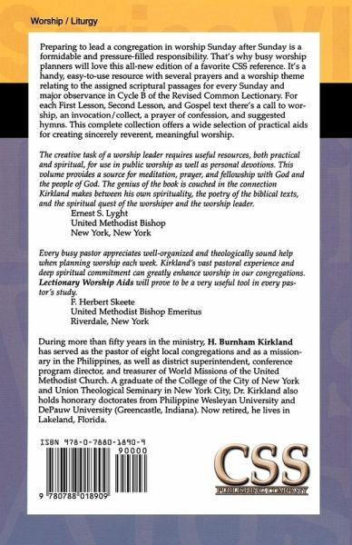 Preparing to lead a congregation in worship Sunday after Sunday is a formidable and pressure-filled responsibility. That's why busy worship planners will love this all-new edition of a favorite CSS reference. It's a handy, easy-to-use resource with several prayers and a worship theme relating to the assigned scriptural passages for every Sunday and major observance in Cycle B of the Revised Common Lectionary. For each First Lesson, Second Lesson, and Gospel text there's a call to worship, an invocation/collect, a prayer of confession, and suggested hymns. This complete collection offers a wide selection of practical aids for creating sincerely reverent, meaningful worship. The creative task of a worship leader requires useful resources, both practical and spiritual, for use in public worship as well as personal devotions. This volume provides a source for meditation, prayer, and fellowship with God and the people of God. The genius of the book is couched in the connection Kirkland makes between his own spirituality, the poetry of the biblical texts, and the spiritual quest of the worshiper and the worship leader. Ernest S. Lyght United Methodist Bishop New York, New York Every busy pastor appreciates well-organized and theologically sound help when planning worship each week. Kirkland's vast pastoral experience and deep spiritual commitment can greatly enhance worship in our congregations. Lectionary Worship Aids will prove to be a very useful tool in every pastor's study. F. Herbert Skeete United Methodist Bishop Emeritus Riverdale, New York During more than fifty years in the ministry, H. Burnham Kirkland has served as the pastor of eight local congregations and as a missionary in the Philippines, as well as district superintendent, conference program director, and treasurer of World Missions of the United Methodist Church. A graduate of the College of the City of New York and Union Theological Seminary in New York City, Dr. Kirkland also holds honorary doctorates from Philippine Wesleyan University and DePauw University (Greencastle, Indiana). Now retired, he lives in Lakeland, Florida.