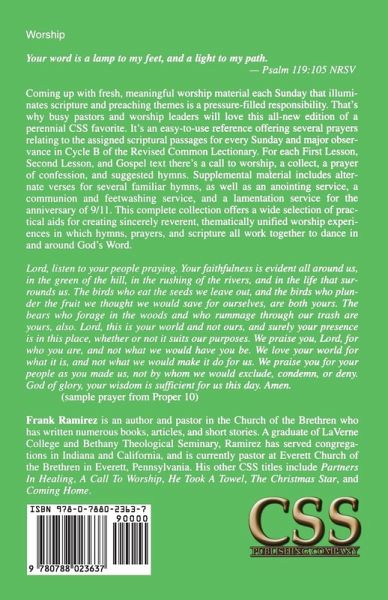Your word is a lamp to my feet, and a light to my path. (Psalm 119:105 NRSV) Coming up with fresh, meaningful worship material each Sunday that illuminates scripture and preaching themes is a pressure-filled responsibility. That's why busy pastors and worship leaders will love this all-new edition of a perennial CSS favorite. It's an easy-to-use reference offering several prayers relating to the assigned scriptural passages for every Sunday and major observance in Cycle B of the Revised Common Lectionary. For each First Lesson, Second Lesson, and Gospel text there's a call to worship, a collect, a prayer of confession, and suggested hymns. Supplemental material includes alternate verses for several familiar hymns, as well as an anointing service, a communion and feetwashing service, and a lamentation service for the anniversary of 9/11. This complete collection offers a wide selection of practical aids for creating sincerely reverent, thematically unified worship experiences in which hymns, prayers, and scripture all work together to dance in and around God's Word. Lord, listen to your people praying. Your faithfulness is evident all around us, in the green of the hill, in the rushing of the rivers, and in the life that surrounds us. The birds who eat the seeds we leave out, and the birds who plunder the fruit we thought we would save for ourselves, are both yours. The bears who forage in the woods and who rummage through our trash are yours, also. Lord, this is your world and not ours, and surely your presence is in this place, whether or not it suits our purposes. We praise you, Lord, for who you are, and not what we would have you be. We love your world for what it is, and not what we would make it do for us. We praise you for your people as you made us, not by whom we would exclude, condemn, or deny. God of glory, your wisdom is sufficient for us this day. Amen. (sample prayer from Proper 10) Frank Ramirez is an author and pastor in the Church of the Brethren who has written numerous books, articles, and short stories. A graduate of LaVerne College and Bethany Theological Seminary, Ramirez has served congregations in Indiana and California, and is currently pastor at Everett Church of the Brethren in Everett, Pennsylvania. His other CSS titles include Partners In Healing, A Call To Worship, He Took A Towel, The Christmas Star, and Coming Home.