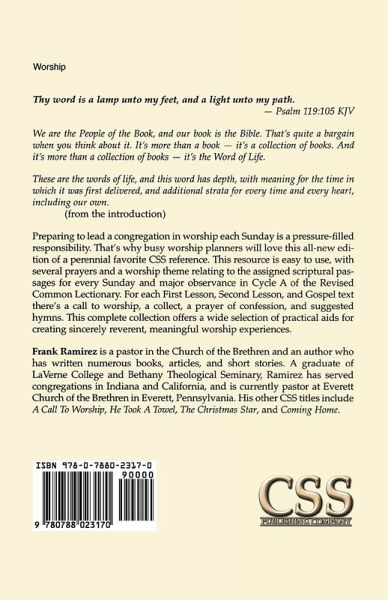 Lectionary Worship Aids by Frank Ramirez is a lectionary book based on Cycle A of the Revised Common Lectionary. Here are some of the topics covered in this lectionary book: Worship Worship resources Worship services Worship aids Lectionary Cycle A of the Revised Common Lectionary Lectionary worship aids Lectionary resources "Thy word is a lamp unto my feet, and a light unto my path. (Psalm 119:105 KJV) We are the People of the Book, and our book is the Bible. That's quite a bargain when you think about it. It's more than a book -- it's a collection of books. And it's more than a collection of books -- it's the Word of Life. These are the words of life, and this word has depth, with meaning for the time in which it was first delivered, and additional strata for every time and every heart, including our own. (from the introduction) Preparing to lead a congregation in worship each Sunday is a pressure-filled responsibility. That's why busy worship planners will love this all-new edition of a perennial favorite CSS reference. This resource is easy to use, with several prayers and a worship theme relating to the assigned scriptural passages for every Sunday and major observance in Cycle A of the Revised Common Lectionary. For each First Lesson, Second Lesson, and Gospel text there's a call to worship, a collect, a prayer of confession, and suggested hymns. This complete collection offers a wide selection of practical aids for creating sincerely reverent, meaningful worship experiences. Frank Ramirez is an author and pastor in the Church of the Brethren who has written numerous books, articles, and short stories. A graduate of LaVerne College and Bethany Theological Seminary, Ramirez has served congregations in Indiana and California, and is currently pastor at Everett Church of the Brethren in Everett, Pennsylvania. His other CSS titles include A Call To Worship, He Took A Towel, The Christmas Star, and Coming Home.