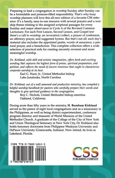 Preparing to lead a congregation in worship Sunday after Sunday can be a formidable and pressure-filled responsibility. That's why busy worship planners will love this all-new edition of a favorite CSS reference. It's a handy, easy-to-use resource with several prayers and a worship theme relating to the assigned scriptural passages for every Sunday and major observance in Cycle A of the Revised Common Lectionary. For each First Lesson, Second Lesson, and Gospel text there's a call to worship, an invocation/collect, a prayer of confession, an offertory prayer, and suggested hymns. But that's not all: each day's material also includes the appointed psalm, words of assurance, a pastoral prayer, and a benediction. This complete collection offers a wide selection of practical aids for creating sincerely reverent and more meaningful worship. Dr. Kirkland, with skill and artistic imagination, offers fresh and exciting wording that captures the highest form of praise, spiritual preparation, and petition, and reflects the mood of sincere reverence that ought to characterize corporate worship at its best. Earl G. Hunt Jr., United Methodist bishop Lake Junaluska, North Carolina Dr. Kirkland, out of a well seasoned and productive ministry, has compiled a helpful worship handbook for pastors who carefully prepare their words and thoughts to give spiritual guidance to the congregation. Roy C. Nichols, United Methodist bishop emeritus Oakland, California During more than fifty years in the ministry, H. Burnham Kirkland served as the pastor of eight local congregations and as a missionary in the Philippines, as well as being district superintendent, conference program director, and treasurer of World Missions of the United Methodist Church. A graduate of the College of the City of New York and Union Theological Seminary in New York City, Dr. Kirkland also holds honorary doctorates from Philippine Wesleyan University and DePauw University (Greencastle, Indiana). Now retired, he lives in Lakeland, Florida.