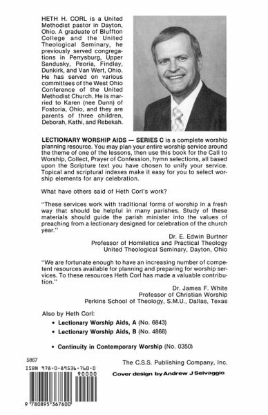 Lectionary Worship Aids, Series C is a complete worship planning resource. You may plan your entire worship service around the theme of one of the lessons, then use this book for the Call to Worship, Collect, Prayer of Confession, hymn selections, all based upon the scripture text you have chosen to unify your service. Topical and scriptural indexes make it easy for you to select worship elements for any celebration. What have others said of Heth Corl's work? These services work with traditional forms of worship in a fresh way that should be helpful in many parishes. Study of these materials should guide the parish minister into the values of preaching from a lectionary designed for celebration of the church year. Dr. E. Edwin Burtner Professor of Homiletics and Practical Theology United Theological Seminary, Dayton, Ohio We are fortunate enough to have an increasing number of competent resources available for planning and preparing for worship services. To these resources Heth Corl has made a valuable contribution. Dr. James F. White Professor of Christian Worship Perkins School of Theology, S.M.U., Dallas, Texas Heth H. Corl is a United Methodist pastor in Dayton, Ohio. A graduate of Bluffton College and the United Theological Seminary, he previously served congregations in Perrysburg, Upper Sandusky, Peoria, Findlay, Dunkirk, and Van Wert, Ohio. He has served on various committees of the West Ohio Conference of the United Methodist Church. He is married to Karen (need Dunn) of Fostoria, Ohio, and they are parents of three children, Deborah, Kathi, and Rebekah.