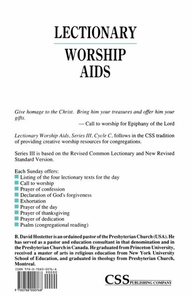 Give homage to the Christ. Bring him your treasures and offer him your gifts. -- Call to Worship for Epiphany of the Lord Lectionary Worship Aids, Series III, Cycle C, follows in the CSS Publishing Company tradition of providing creative worship resources for congregations. Series III is based on the Revised Common Lectionary and New Revised Standard Version. Each Sunday offers: • Listing of the four lectionary texts for the day • Call to worship • Prayer of confession • Declaration of God's forgiveness • Exhortation • Prayer of the day • Prayer of thanksgiving • Prayer of dedication • Psalm (congregational reading) B. David Hostetter is a retired pastor of the Presbyterian Church USA. He served as a pastor and education consultant in that denomination and in the Presbyterian Church in Canada. He graduated from Princeton University, received a master of arts in religious education from New York University School of Education, and graduated in theology from Presbyterian Church, Montreal.