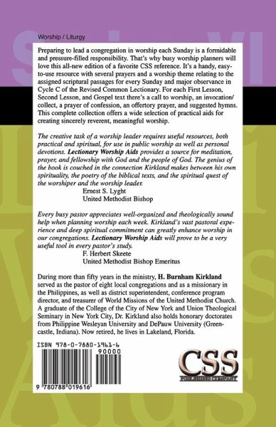 Preparing to lead a congregation in worship each Sunday is a formidable and pressure-filled responsibility. That's why busy worship planners will love this all-new edition of a favorite CSS reference. It's a handy, easy-to-use resource with several prayers and a worship theme relating to the assigned scriptural passages for every Sunday and major observance in Cycle C of the Revised Common Lectionary. For each First Lesson, Second Lesson, and Gospel text there's a call to worship, an invocation/collect, a prayer of confession, an offertory prayer, and suggested hymns. This complete collection offers a wide selection of practical aids for creating sincerely reverent, meaningful worship. The creative task of a worship leader requires useful resources, both practical and spiritual, for use in public worship as well as personal devotions. Lectionary Worship Aids provides a source for meditation, prayer, and fellowship with God and the people of God. The genius of the book is couched in the connection Kirkland makes between his own spirituality, the poetry of the biblical texts, and the spiritual quest of the worshiper and the worship leader. Ernest S. Lyght United Methodist Bishop Every busy pastor appreciates well-organized and theologically sound help when planning worship each week. Kirkland's vast pastoral experience and deep spiritual commitment can greatly enhance worship in our congregations. Lectionary Worship Aids will prove to be a very useful tool in every pastor's study. F. Herbert Skeete United Methodist Bishop Emeritus During more than fifty years in the ministry, H. Burnham Kirkland served as the pastor of eight local congregations and as a missionary in the Philippines, as well as district superintendent, conference program director, and treasurer of World Missions of the United Methodist Church. A graduate of the College of the City of New York and Union Theological Seminary in New York City, Dr. Kirkland also holds honorary doctorates from Philippine Wesleyan University and DePauw University (Greencastle, Indiana). Now retired, he lives in Lakeland, Florida.