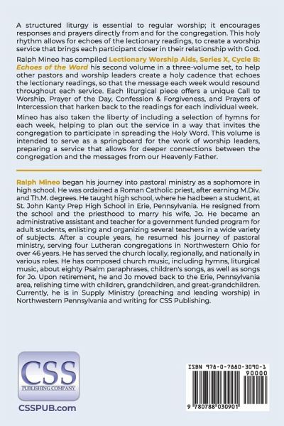 A structured liturgy is essential to regular worship; it encourages responses and prayers directly from and for the congregation. This holy rhythm allows for echoes of the lectionary readings, to create a worship service that brings each participant closer in their relationship with God. Ralph Mineo has compiled Lectionary Worship Aids, Series X, Cycle B: Echoes of the Word, his second volume in a three-volume set, to help other pastors and worship leaders create a holy cadence that echoes the lectionary readings, so that the message each week would resound throughout each service. Each liturgical piece offers a unique Call to Worship, Prayer of the Day, Confession & Forgiveness, and Prayers of Intercession that harken back to the readings for each individual week. Mineo has also taken the liberty of including a selection of hymns for each week, helping to plan out the service in a way that invites the congregation to participate in spreading the Holy Word. This volume is intended to serve as a springboard for the work of worship leaders, preparing a service that allows for deeper connections between the congregation and the messages from our Heavenly Father.