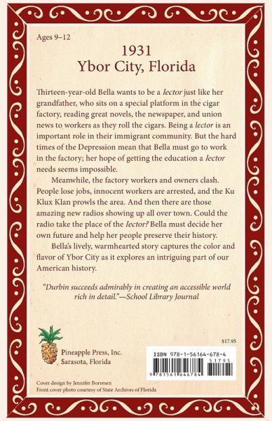 Thirteen-year-old Bella wants to be a lector just like her grandfather, who sits on a special platform in the cigar factory, reading great novels, the newspaper, and union news to workers as they roll the cigars. Being a lector is an important role in their immigrant community. But the hard times of the Depression mean that Bella must go to work in the factory; her hope of getting the education a lector needs seems impossible. Meanwhile, the factory workers and owners clash. People lose jobs, innocent workers are arrested, and the Ku Klux Klan prowls the area. And then there are those amazing new radios showing up all over town. Could the radio take the place of the lector? Bella must decide her own future and help her people preserve their history. Bella's lively, warmhearted story captures the color and flavor of Ybor City as it explores an intriguing part of our American history.
