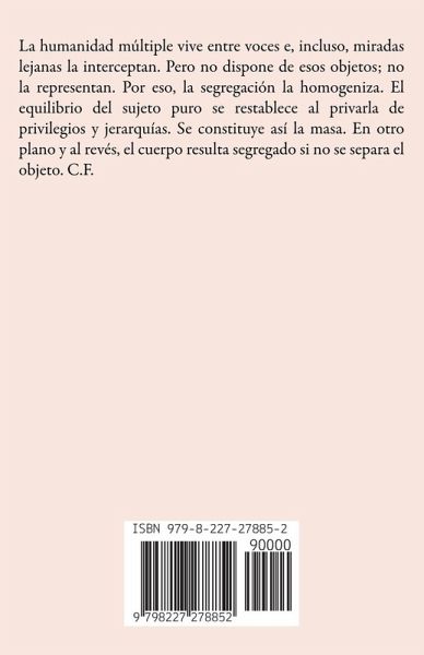 La humanidad múltiple vive entre voces e, incluso, miradas lejanas la interceptan. Pero no dispone de esos objetos; no la representan. Por eso, la segregación la homogeniza. El equilibrio del sujeto puro se restablece al privarla de privilegios y jerarquías. Se constituye así la masa. En otro plano y al revés, el cuerpo resulta segregado si no se separa el objeto. C.F.