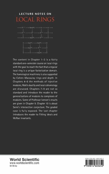 The content in Chapter 1–3 is a fairly standard one-semester course on local rings with the goal to reach the fact that a regular local ring is a unique factorization domain. The homological machinery is also supported by Cohen–Macaulay rings and depth. In Chapters 4–6 the methods of injective modules, Matlis duality and local cohomology are discussed. Chapters 7–9 are not so standard and introduce the reader to the generalizations of modules to complexes of modules. Some of Professor Iversen's results are given in Chapter 9. Chapter 10 is about Serre's intersection conjecture. The graded case is fully exposed. The last chapter introduces the reader to Fitting ideals and McRae invariants.