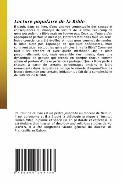 Il s'agit, dans ce livre, d'une analyse contextuelle des causes et conséquences du manque de lecture de la Bible. Beaucoup de gens possèdent la Bible mais ne l'ouvre pas. Ceux qui l'ouvre s'en approprient parfois le message, l'interprétant dans tous les sens. Notre conscience a été éveillée et nous nous sommes demandés: la Bible n'est pas l'apanage de quelques spécialistes, mais comment aider surtout les gens simples à lire la Bible? Comment faut-il s'y prendre et avec quelle méthode? Lire la Bible personnellement, oui, mais ensemble c'est mieux, dans une dynamique de groupe qui prends en compte chacun comme acteur et porteur d'une expérience à partager. Que la Bible parle à chacun, à partir de certains personnages anciens et leurs évènements dans lesquels se plonge le monde d'aujourd'hui. Sa lecture demande une certaine initiation du fait de la complexité et de l'altérité de la Bible.