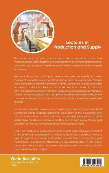Production and supply analysis are core components of applied microeconomics. Taken together with considerations of demand and marketing, production and supply complete the nexus of what comprises modern applied economics. Lectures in Production and Supply presents the core components of modern theories of production and market conditions from the supply side. Analysis under conditions of perfect information is initially considered to demonstrate key concepts in production. The focus is on applied empirical models of production within an economic context. Production under conditions of uncertainty and risk aversion is then considered in a comprehensive manner. Mechanisms for the management of production risk, particularly to insurance, are then developed in detail. Household production is also a key consideration in production analysis. Most purchased goods undergo additional production at the household level prior to consumption and this production complicates the analysis of market relationships. The demand for leisure and the concomitant supply of labor and allocation of time are key considerations in household models. Finally, the multitude of policies that impact market relationships are important to any analytical consideration of market relationships. A particular focus is given to agricultural policies and related markets. The coupling of support mechanisms to production decisions is a key consideration in any policy deliberation. Hence, these mechanisms are given careful consideration within the context of policy analysis.