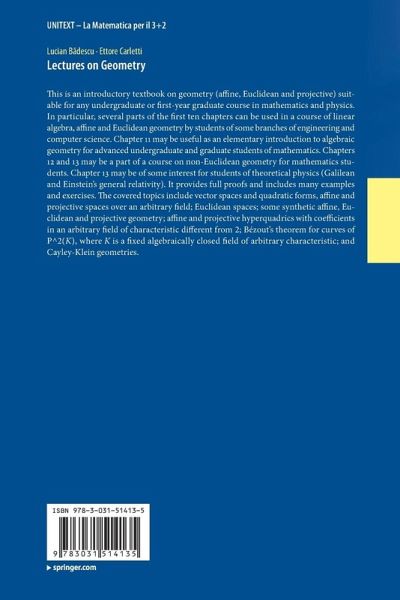 1 Linear Algebra.- 2 Bilinear and quadratic forms.- 3 Affine Spaces.- 4 Euclidean Spaces.- 5 Affine hyperquadrics.- 6 Projective Spaces.- 7 Desargues' Axiom.- 8 General Linear Projective Automorphisms.- 9 Affine Geometry and Projective Geometry.- 10 Projective hyperquadrics.- 11 Bezout's Theorem for Curves of P^2(K).- 12 Absolute plane geometry.- 13 Cayley-Klein Geometries