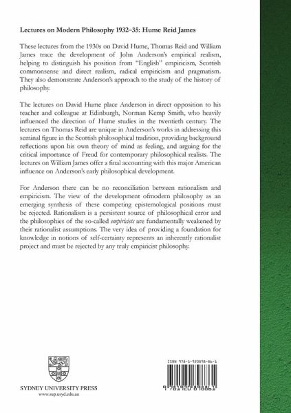 These lectures from the 1930s on David Hume, Thomas Reid and William James trace the development of John Anderson's empirical realism, helping to distinguish his position from "English" empiricism, Scottish commonsense and direct realism, radical empiricism and pragmatism. They also demonstrate Anderson's approach to the study of the history of philosophy. The lectures on David Hume place Anderson in direct opposition to his teacher and colleague at Edinburgh, Norman Kemp Smith, who heavily influenced the direction of Hume studies in the twentieth century. The lectures on Thomas Reid are unique in Anderson's works in addressing this seminal figure in the Scottish philosophical tradition, providing background reflections upon his own theory of mind as feeling, and arguing for the critical importance of Freud for contemporary philosophical realists. The lectures on William James offer a final accounting with this major American influence on Anderson's early philosophical development. For Anderson there can be no reconciliation between rationalism and empiricism. The view of the development modern philosophy as an emerging synthesis of these competing epistemological positions must be rejected. Rationalism is a persistent source of philosophical error and the philosophies of the so-called "empiricists" are fundamentally weakened by their rationalist assumptions. The very idea of providing a foundation for knowledge in notions of self-certainty represents an inherently rationalist project and must be rejected by any truly empiricist philosophy.