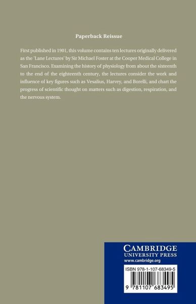 First published in 1901, this volume contains ten lectures originally delivered as the 'Lane Lectures' by Sir Michael Foster at the Cooper Medical College in San Francisco. Examining the history of physiology from about the sixteenth to the end of the eighteenth century, the lectures consider the work and influence of key figures such as Vesalius, Harvey and Borelli, and chart the progress of scientific thought on matters such as digestion, respiration and the nervous system.
